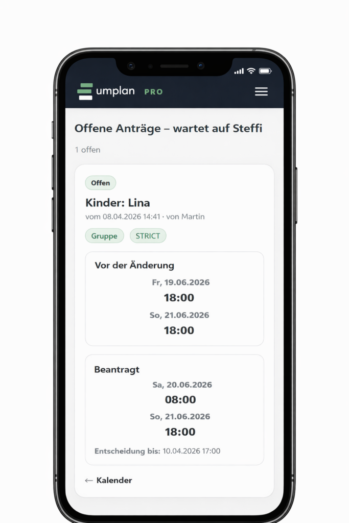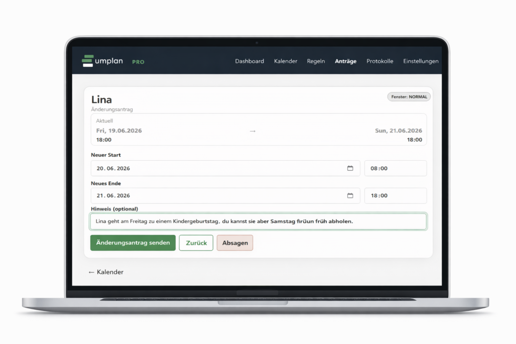 Änderungen sollen nicht daran scheitern, dass eine Anfrage übersehen wird oder bewusst unbeantwortet bleibt. Deshalb lässt sich in Umplan genau festlegen, wie lange der andere Elternteil für eine Rückmeldung Zeit hat und auf welche Weise über eine Änderung entschieden wird. So ist für beide Seiten von Anfang an klar, bis wann reagiert werden muss und was gilt, wenn innerhalb dieser Frist keine Rückmeldung erfolgt.