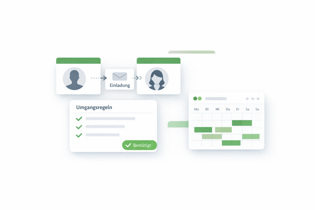 Die Einrichtung ist bewusst einfach gehalten und hilft dir, die Organisation eurer Umgangstermine Schritt für Schritt aufzubauen – von der Einladung des anderen Elternteils über gemeinsam bestätigte Umgangsregeln bis zur übersichtlichen Verwaltung der Termine.