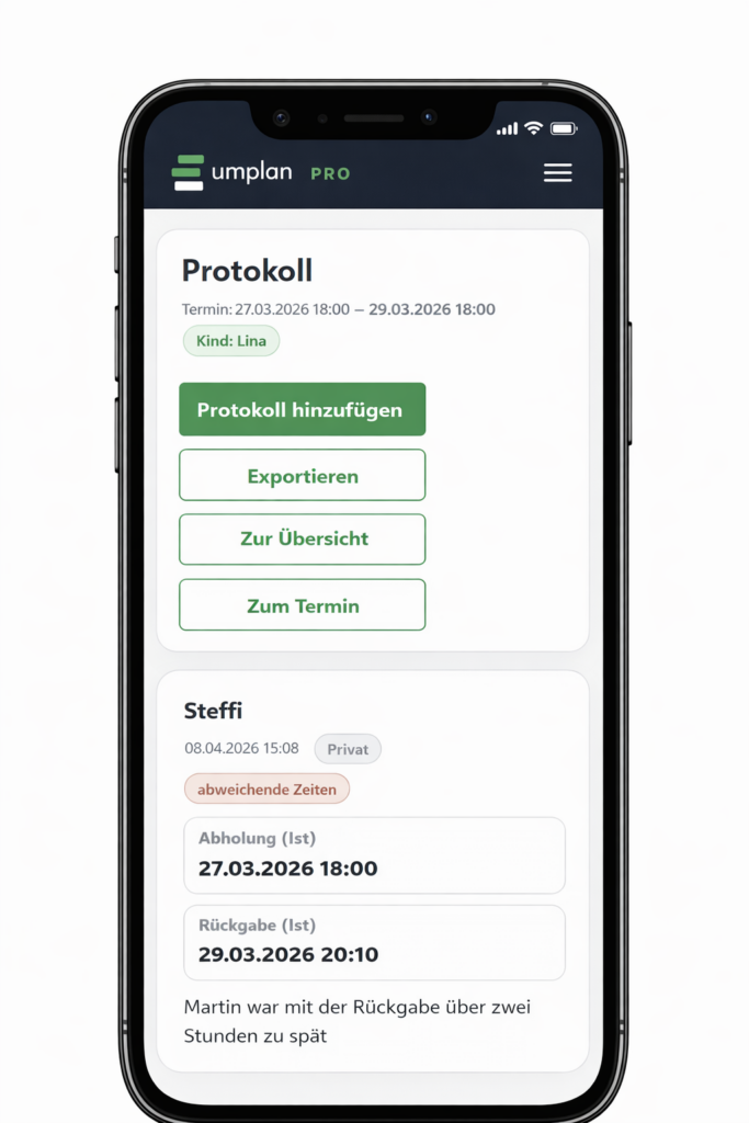 Der umgangsberechtigte Elternteil braucht dabei oft mehr Verlässlichkeit, klare Absprachen und eine nachvollziehbare Dokumentation. Der Elternteil, bei dem das Kind überwiegend lebt, braucht vor allem Übersicht, Planungssicherheit und eine Organisation, auf die im Alltag Verlass ist. Umplan stärkt deshalb nicht eine Seite, sondern entlastet beide dort, wo schwierige Kommunikation sonst immer wieder zu Unsicherheit und zusätzlichem Stress führt.