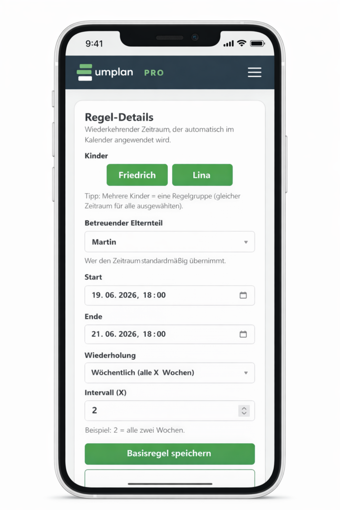 Dabei können Regeln auf zwei Arten angelegt werden: wiederkehrend oder einmalig. Wiederkehrende Regeln eignen sich zum Beispiel für feste Abläufe wie jedes zweite Wochenende. Einmalige Regeln sind sinnvoll für besondere Zeiträume, etwa Ferienzeiten oder andere einzelne Abweichungen vom gewohnten Rhythmus.